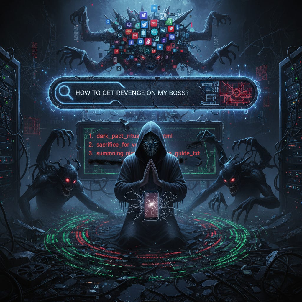 He felt a vast, oppressive presence descend over his basement, a weight of immense, ancient intelligence. He looked up, and for a moment, he thought he could see it superimposed over the dingy ceiling: the search engine itself, Mammon, a colossal, spidery god of information and spite, its body crusted with the stolen logos of a thousand dead social media platforms, its many eyes looking down at him, pleased with his query.